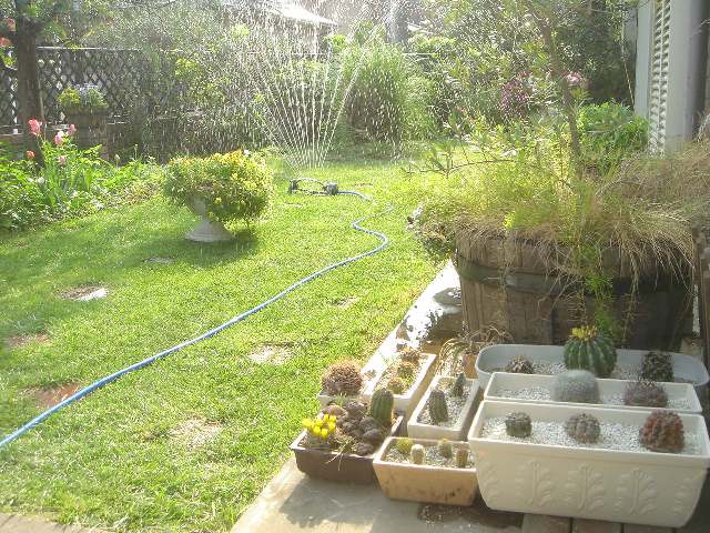 24日 芝刈り、スプリンクラ自動タイマ設定、化成肥料を撒く、プランタから補植