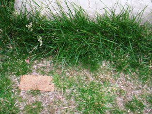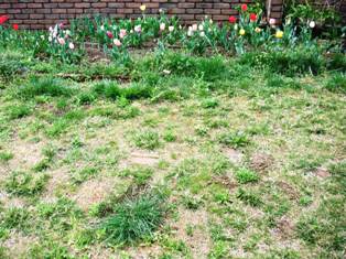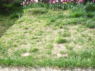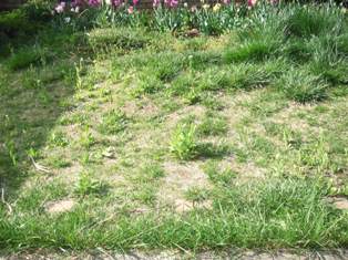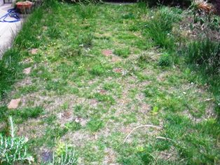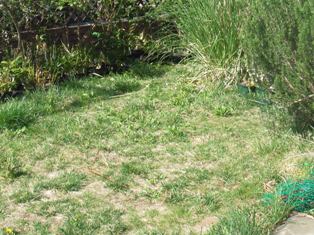 庭の周辺で境にレンガを置いたり、テラスとの境や、中央に踏み石を置くとその周りなどは、比較的元気です。踏まれないせいもありますが、芝生だけの広い日向よりも乾きにくいのが理由と思われます。そこで、広くて毎年枯れやすい場所があれば、踏み石を適当に並べて、少しでも乾きを抑える場所を作ってやると、枯れも抑えられます。
