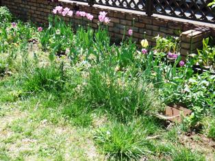 西から両縁が茂ってきました。 南の花壇との境では穂が出て実がなっています。 北の縁のテラス戸の境も茂っています。